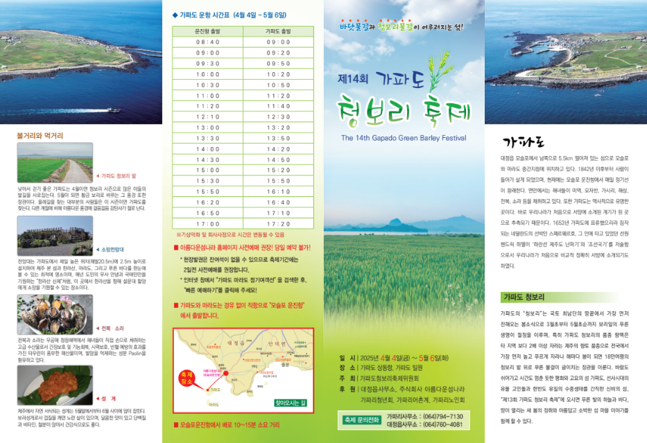 가파도 청보리 축제는 매년 4월 초순부터 5월 초순까지 약 한 달 동안 진행되며, 2025년 기준으로 제14회를 맞이합니다. 올해 축제는 4월 4일부터 5월 6일까지 가파도 일원에서 열리며, 개막식 및 본 행사는 4월 4일부터 7일까지 집중적으로 진행됩니다. 축제는 무료로 입장 가능하며, 주로 주말(토요일, 일요일)에 주요 프로그램이 운영됩니다. 축제 기간 동안 모슬포항에서 가파도를 오가는 여객선은 평소 1일 9편에서 17편으로 증편되어 관광객들의 접근성을 높입니다.