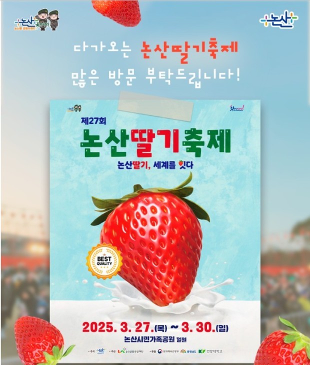 2025년 논산 딸기 축제는 3월 27일(목)부터 3월 30일(일)까지 4일간 논산시민가족공원 및 시민운동장 일원에서 열릴 예정입니다. 이는 딸기 출하 시기와 맞물려 봄철을 맞이하는 시점에 열리며, 날씨가 따뜻해지면서 가족 단위 관광객들이 방문하기에 적합한 시기입니다. 축제는 "논산 딸기와 사랑에 빠지다"라는 주제를 중심으로 다채로운 프로그램을 선보이며, 특히 2027년 논산 세계 딸기 산업 엑스포를 목표로 한층 업그레이드된 모습을 보여줄 것으로 기대됩니다.